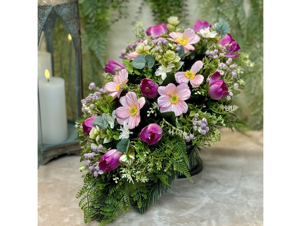 Jarný zaťažený aranžmán na hrob tulipán 50x30cm